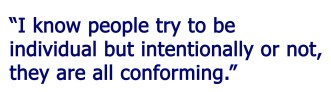 I was reading something about people wanting to be different and that whilst some may not be wearing exactly the same thing, they still fall into a group. I know people try to be individual but intentionally or not, they are all conforming.